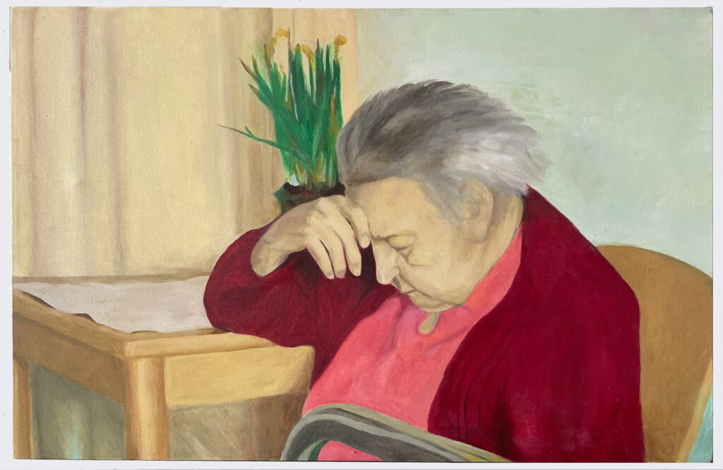 “This series explores sleep and rest as a psychological and physiological process that offers a withdrawal from habitual thought and wakeful consciousness, even if it is just temporarily. Painting these medium- large scale works became a slow meditation on time and perception, influenced by the heightened awareness that is needed while translating observation into paint. The subject matter are acquaintances and friends I observed in a semi-public setting.”